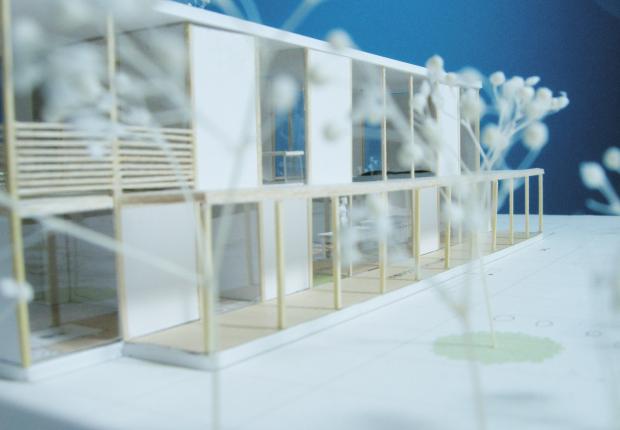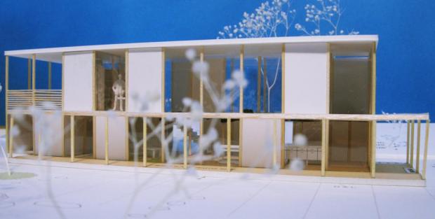 埼玉県に計画した個人住宅。高齢者居住に対応したバリアフリー住宅。道路と敷地は約3mの高低差があり、道路から住宅の2階部分を透かして遠くの山々の印象的な眺望が見えるように計画した。